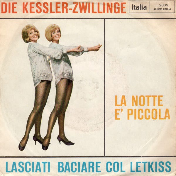 In ogni caso, dal punto di vista artistico, per me non c’è “Dadaumpa” che tenga, io penso solo al “Letkiss”. Il Letkiss o Let’s kiss o Letkis o Letkajenkka è un ballo finlandese che ebbe diffusione nei primi anni ‘60, una danza figlia del precedente Bunny Hop (nato alla Balboa High School di San Francisco nel 1952) in cui i movimenti di alcune parti di gambe e piedi, talloni e punte, è particolarmente importante. Come capirete si tratta dunque di qualcosa di perfetto da affidare alle gambe mediatiche e moltiplicate più famose d’Italia, e mentre tutte e tutti sono intenti a darsi al twist e al chachacha, le Kessler optano per un Letkiss, di certo meno mainstream. Il pezzo esce in italiano con testo adattato per noi da Vito Pallavicini, paroliere vigevanese e firma di molte uscite di successo dell’epoca, tra cui non ultimo il testo di “Azzurro” di Paolo Conte. Siamo nel 1963 e “Lasciati baciare col letkiss” è il lato B del 45 giri di “La notte è piccola”, sul disco campeggia la scritta: Le gemelle Kessler vi presentano il letkiss, il ballo dell’anno, la musica è infatti quella originale di Erik Lindström: ha qualcosa di crudele, di drammatico, di spaventoso, qualcosa che si contrappone emotivamente al testo in modo molto spiccato e inevitabilmente accentuato dalle due voci che cantano all’unisono.